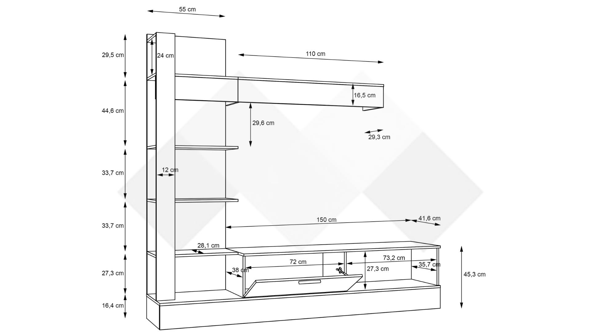 смМясто за телевизор: В: 97 см Ш: 41.6 см Д: 150 см