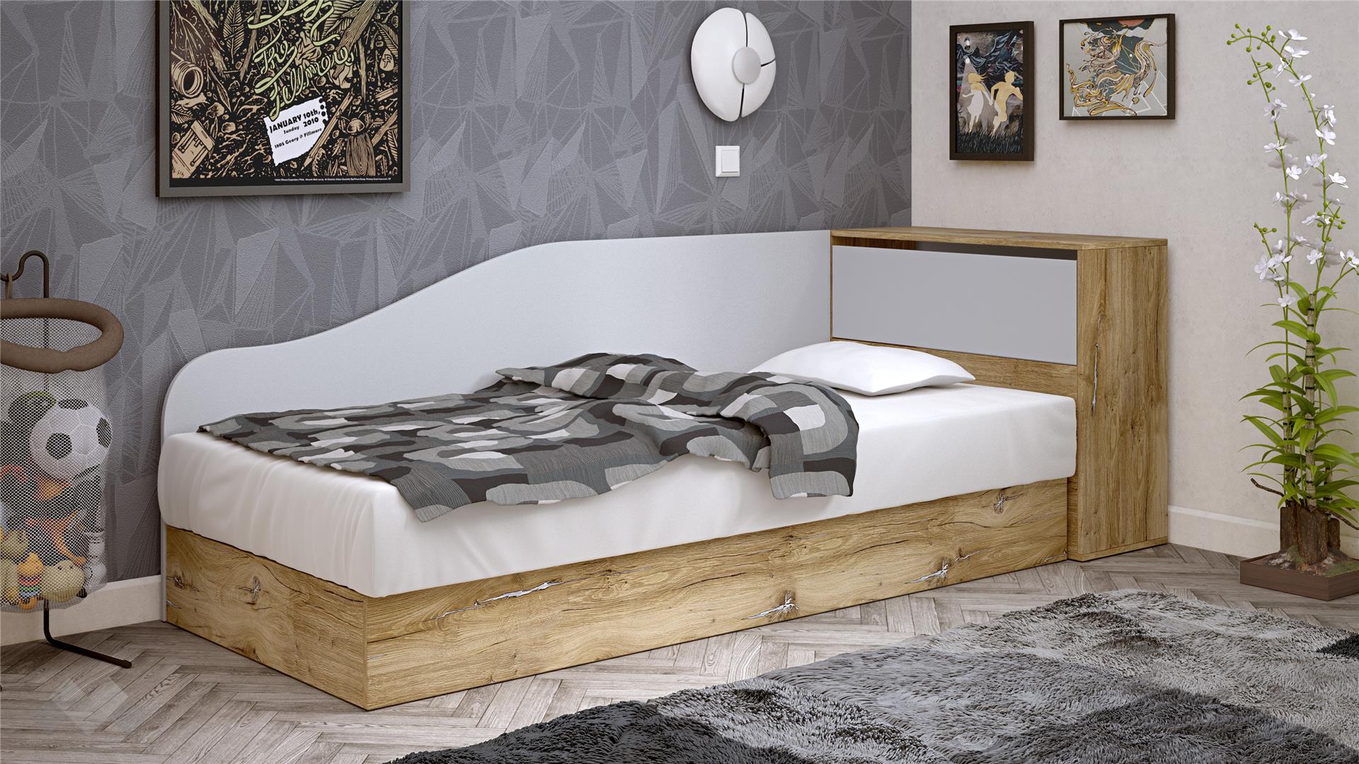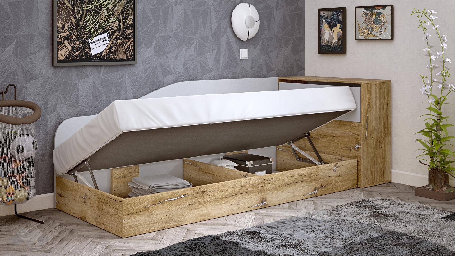 Леглото е проектирано с извита, мека линия на таблата, която едновременно служи като облегалка и предпазва стената. С механизът за повдигане на матрака и компактната ракла ти предоставяме изключително ценно допълнително място за съхранение на спално бельо, играчки, дрехи или други вещи, спомагайки за поддържане на реда в стаята.
