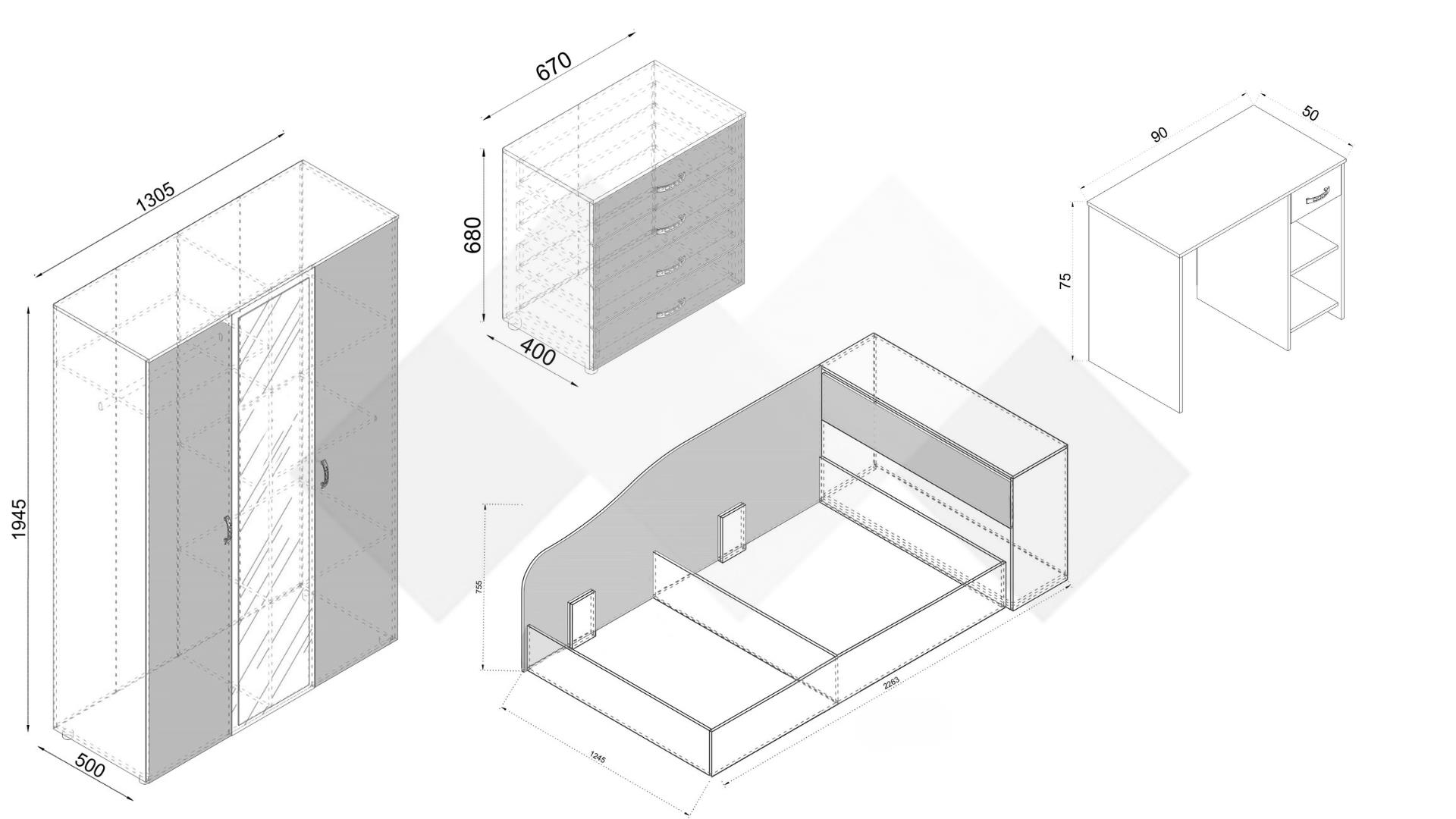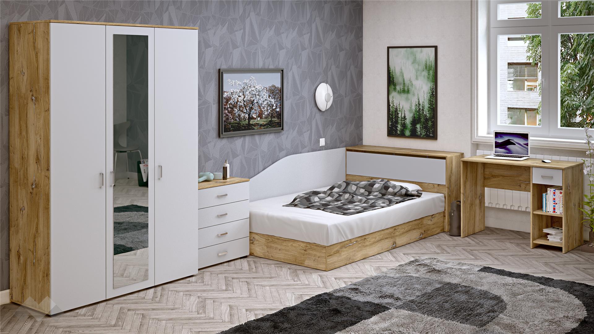 ✓ 16 мм ПДЧ ✓ приста за матрак 120/190 ✓ механизъм за повдигане на матрака ✓ ракла ✓ трикрилен гардероб ✓ огледало ✓ лост за закачалки ✓3 рафта ✓ бюро ✓ чекмедже ✓ скрин ✓ 4 чекмеджета ✓ модерен дизайн ✓ качествена изработка