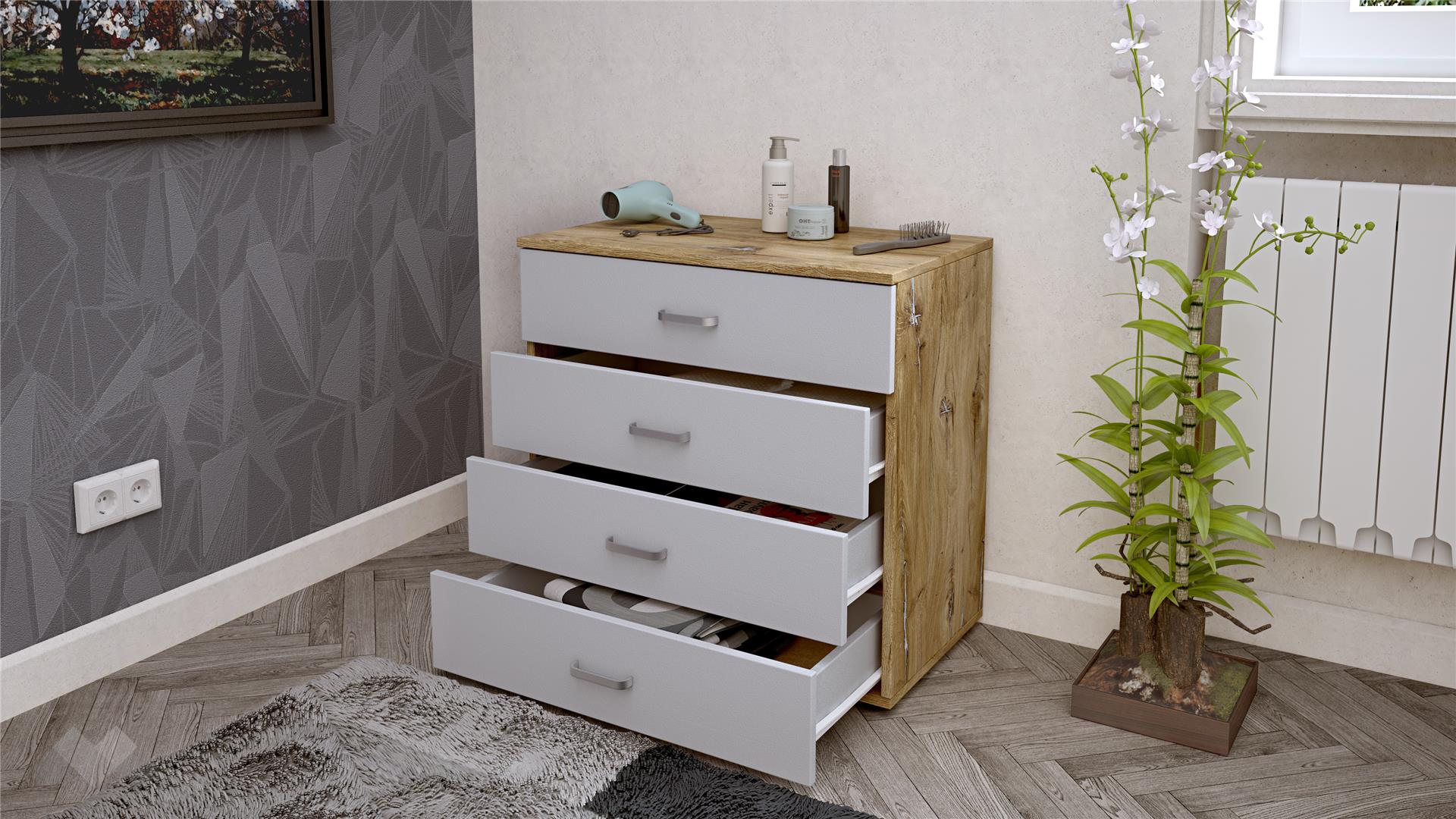 Четирите чекмеджета на скрина са удобни за подреждане на сгънати дрехи, обувки и кутии за съхранение. Просторния плот ти предоставя място за вещи, които да са ти винаги под ръка.