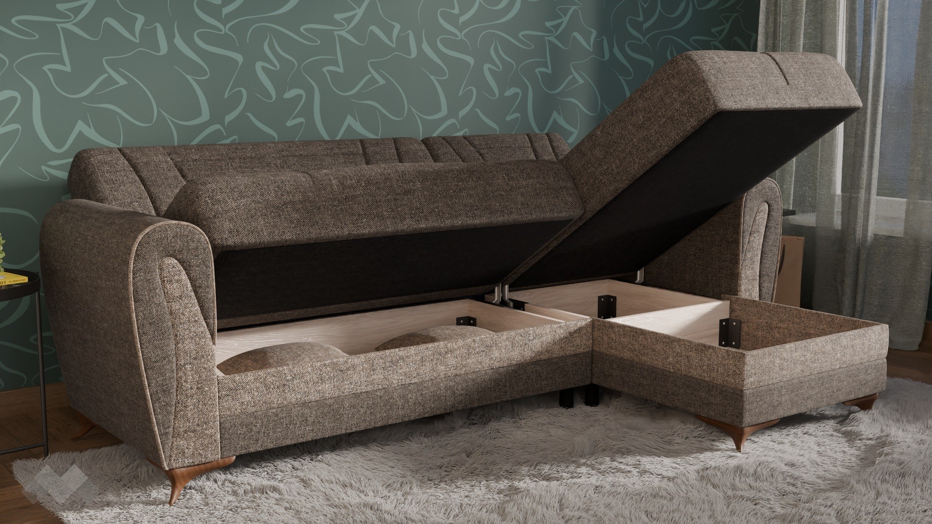 Практичните ракли под седалната част и под лежанката ти предлагат дискретно място за съхранение на завивки, възглавници и други вещи, които искаш да са ти под ръка, но същевременно прибрани. Дамаската е приятна на допир, изработена от здрав и устойчив текстил.