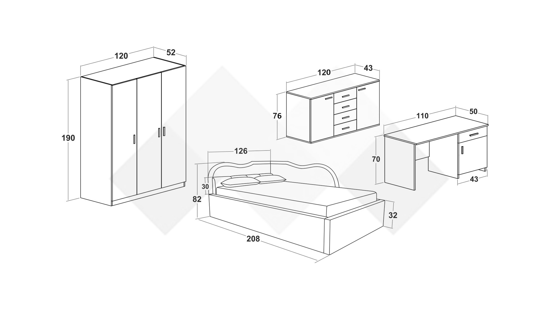 ⭐ Предимства: ✓ легло с тапицирана табла и основа ✓ трикрилен гардероб ✓ лост за закачалки  ✓ скрин с 4 чекмеджета и 2 шкафа ✓ бюро ✓ модерен дизайн ✓ елегантна визия ✓ повдигащ механизъм ✓ качествена изработка