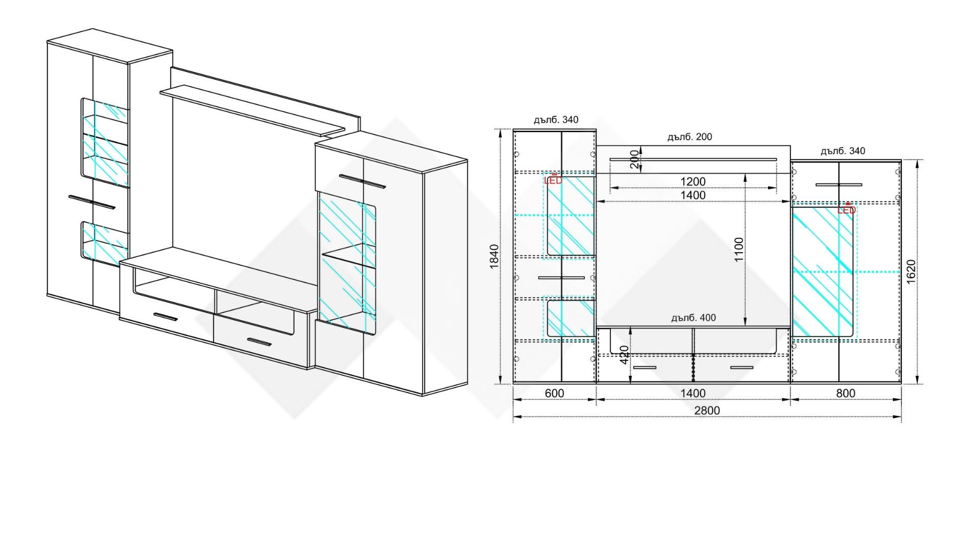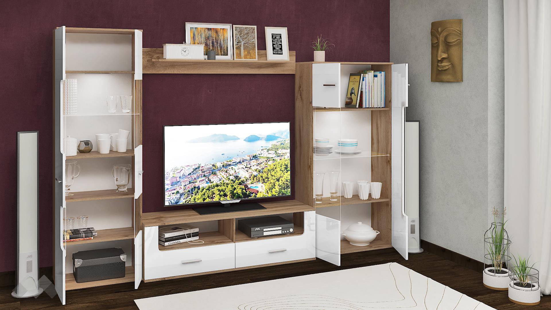 Модерна, стилна, блестяща - секция Шери ще те впечатли. Тя е снабдена с ТВ шкаф с две чекмеджета и две отворени ниши за допълнителни устройства, декодери и др. Две изящни стъклени витрини за красиви съдове и украси, които не би искал да останат скрити от погледите на твоите гости, и горен рафт за любимите ти книги и фотографии.