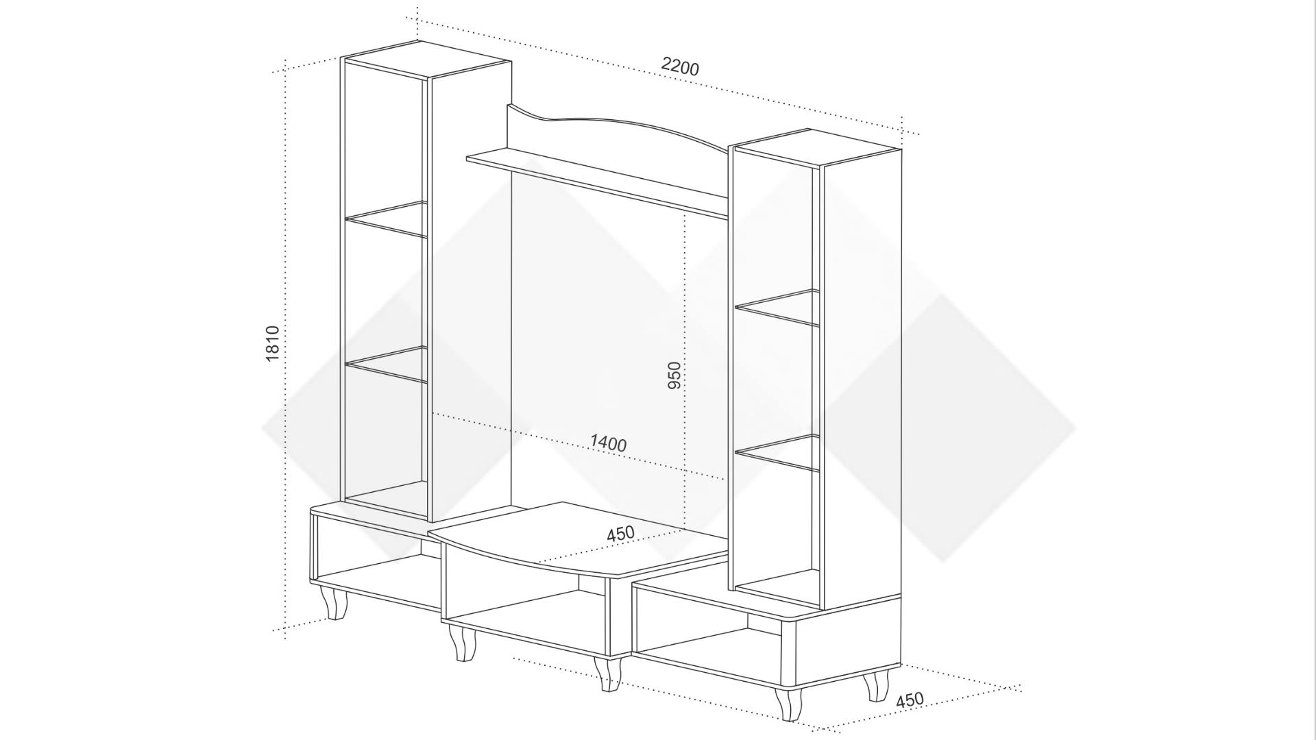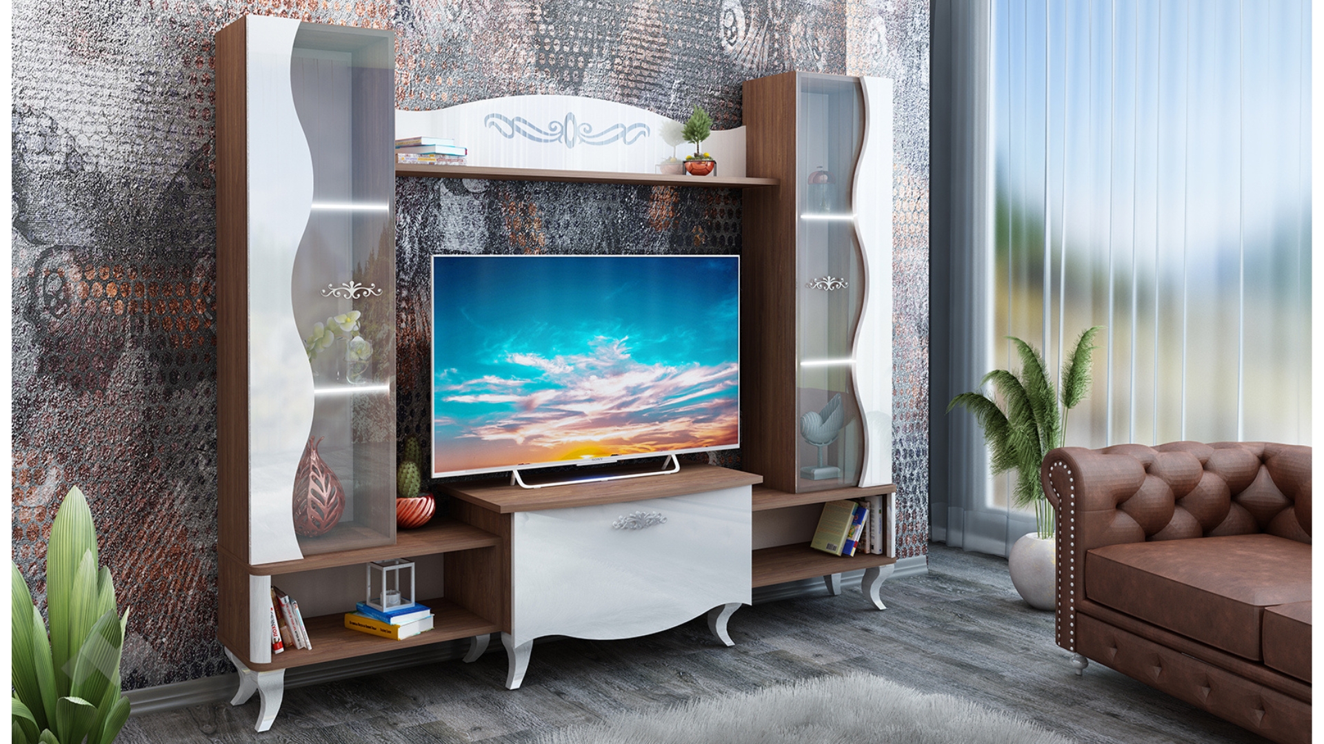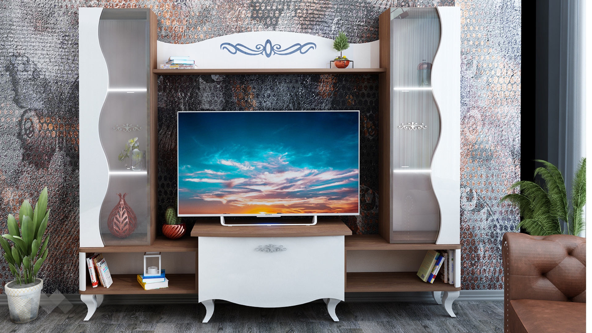 Тя разполага с два витринни шкафа - там ще намерят място всичките ти красиви сервизи, любими сувенири или стилни декорации. Допълнителното LED осветление ще акцентира още повече върху тях и ще ги накара да засияят, благодарение на това няма как да убегнат от погледите на гостите ти. ТВ шкафът е съставен от едно затворено пространство и още две ниши до него. В тях можеш да поставиш цялата си съпътстваща техника като ТВ приемници, DVD плейъри или друга техника. Още един широк рафт се разполага над мястото за телевизора – там можеш да аранжираш със скъпи спомени като фотографии или сувенири, а може и да аранжираш със стилни декорации и украси – изборът е твой! Секцията е декорирана с красиви орнаменти и стои върху ефектни, извити бели крачета.
