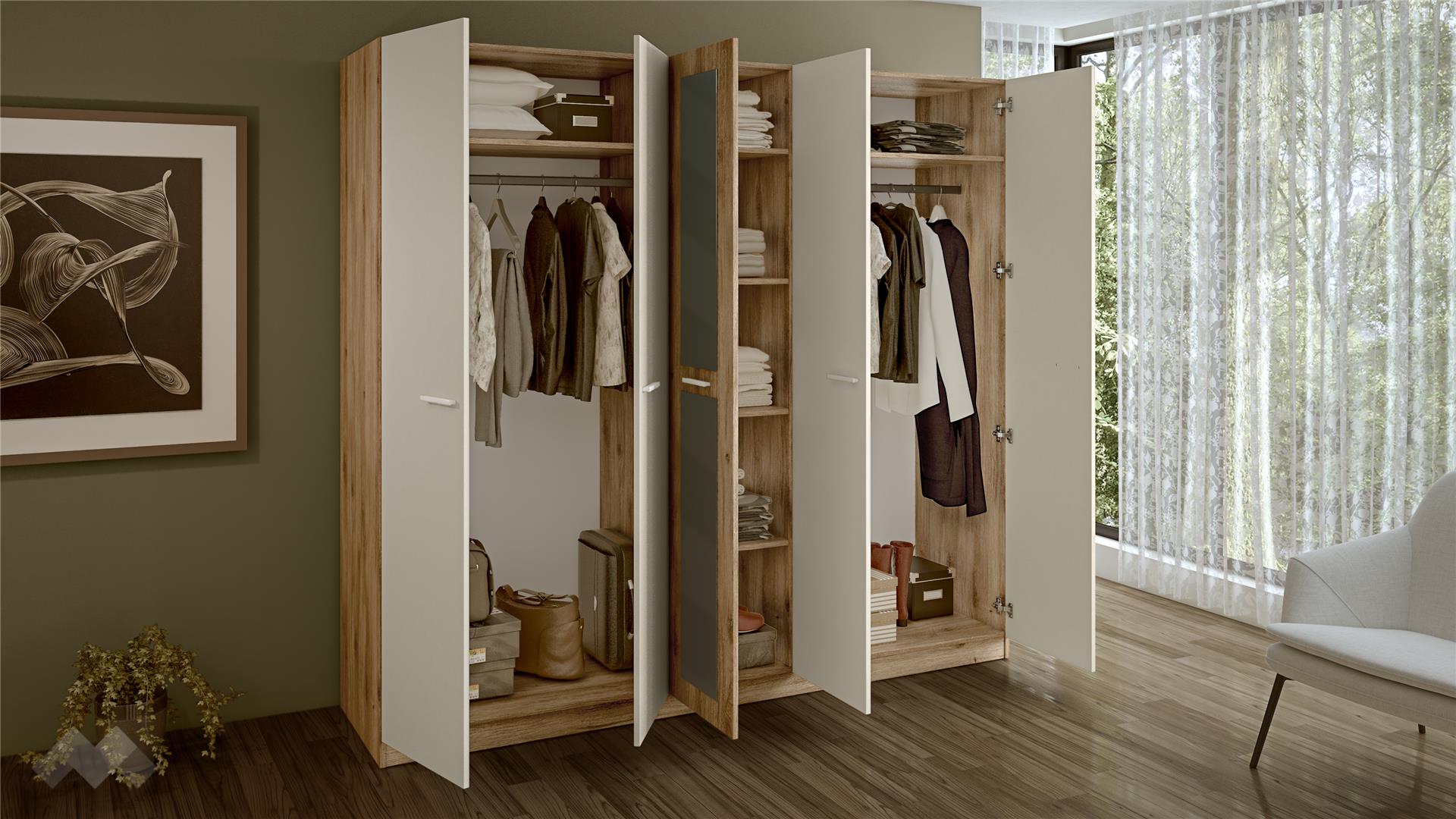 Гардеробът разполага с пет крила, осигуряващи огромно пространство за организирано съхранение на дрехи, аксесоари и спално бельо.