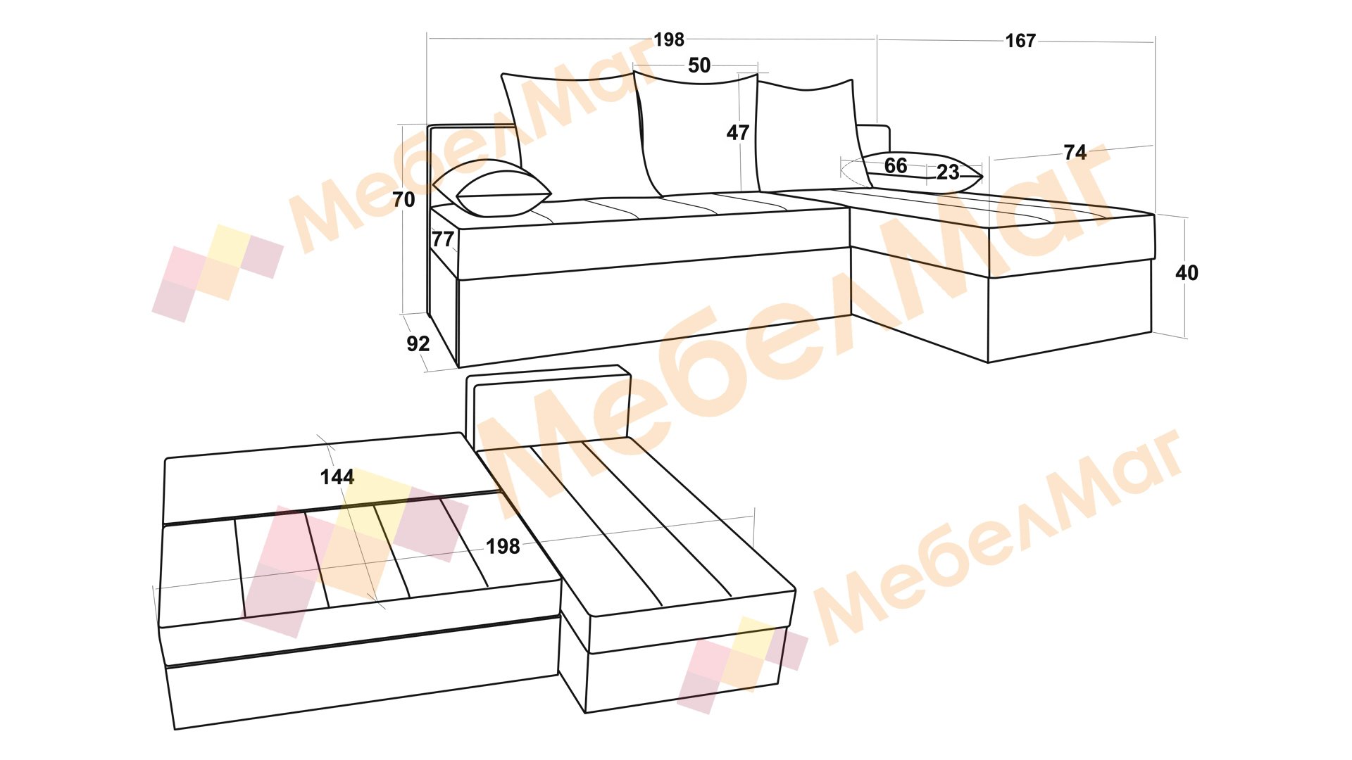 Д: 198 см. Ш: 167 см. В: 70 см.