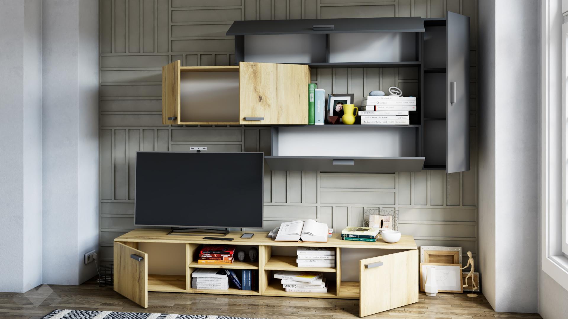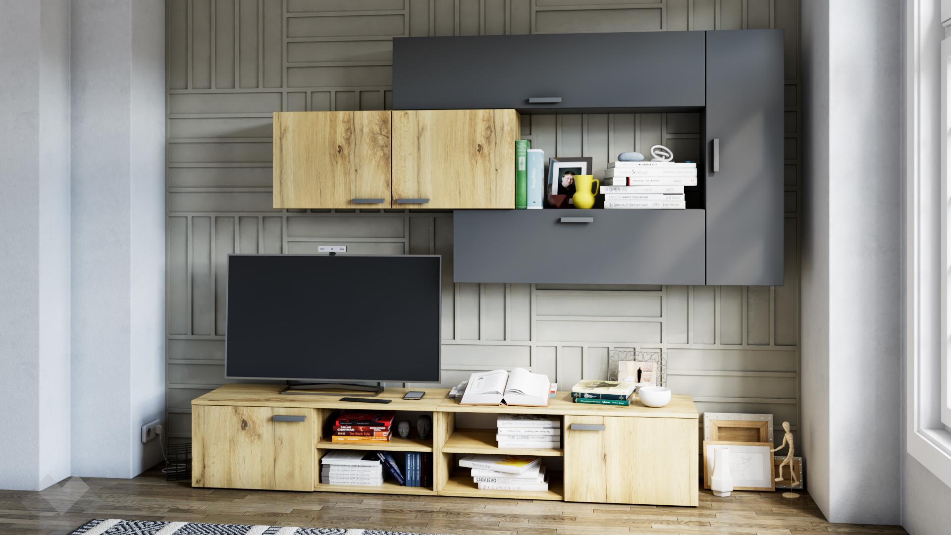 ⭐ Предимства: ✓ модерен дизайн ✓ ТВ шкаф ✓ 4 окачени шкафа с вратички ✓ няколко варианта за монтаж ✓ качествена изработка ✓ 16 мм ПДЧ