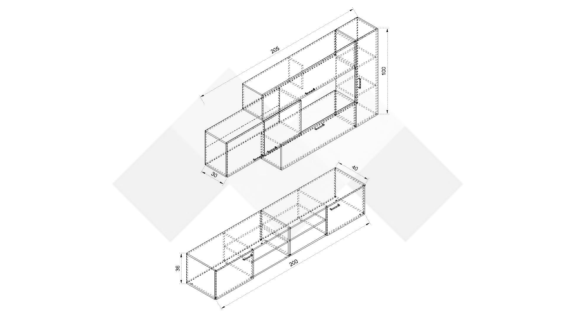 Окачени шкафове: Д: 205 см Ш: 30 см В: 100 см