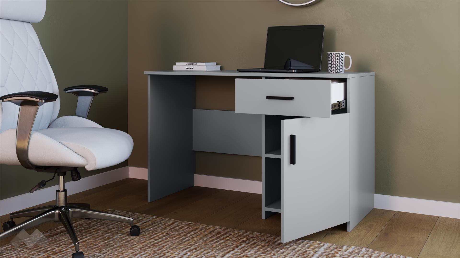Бюрото разплага с чекмедже и с шкаф с вратичка. Чекмеджето е снабдено със сачмени водачи с пълно изтегляне и плавно прибиране, характеризиращи се със стабилност, устойчивост и издръжливост при по-голямо натоварване. Отваряйки вратата на шкафа ще откриеш удобен вътрешен рафт, което ще ти осигури оптимално използване на пространството.