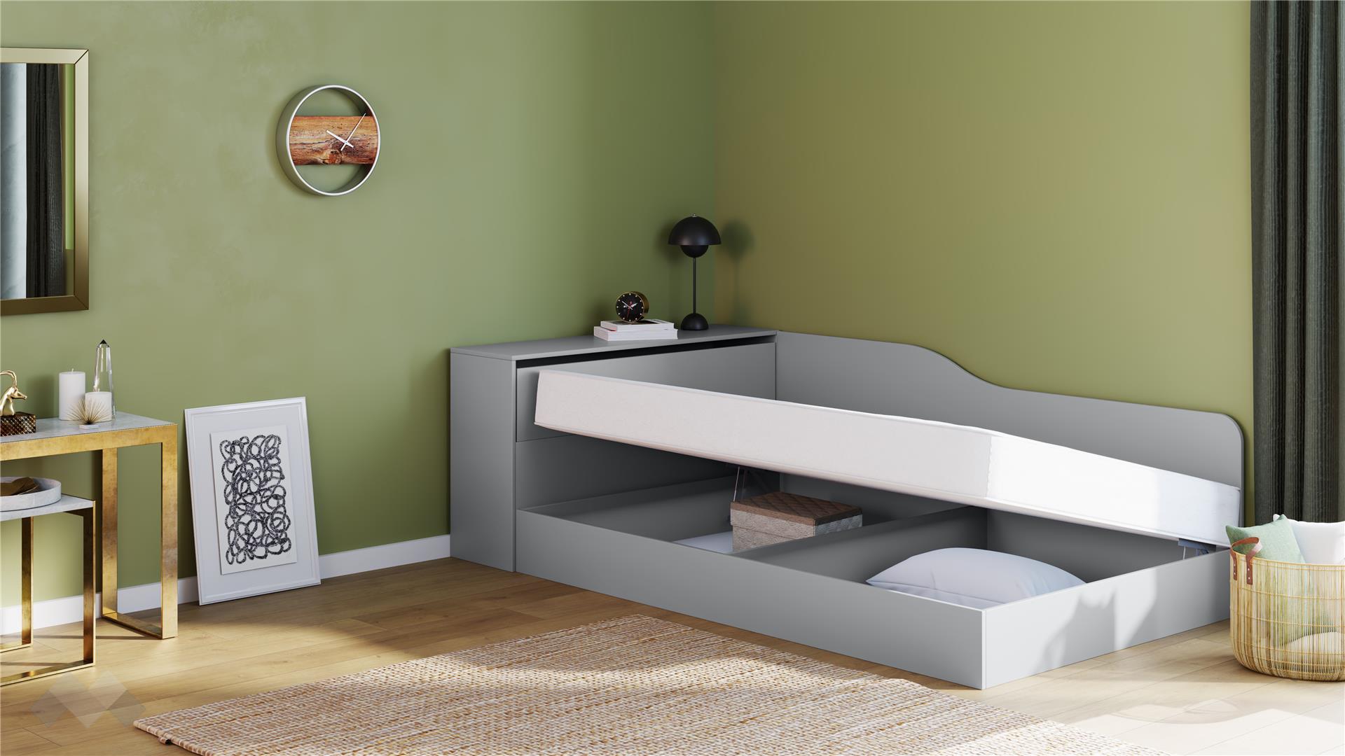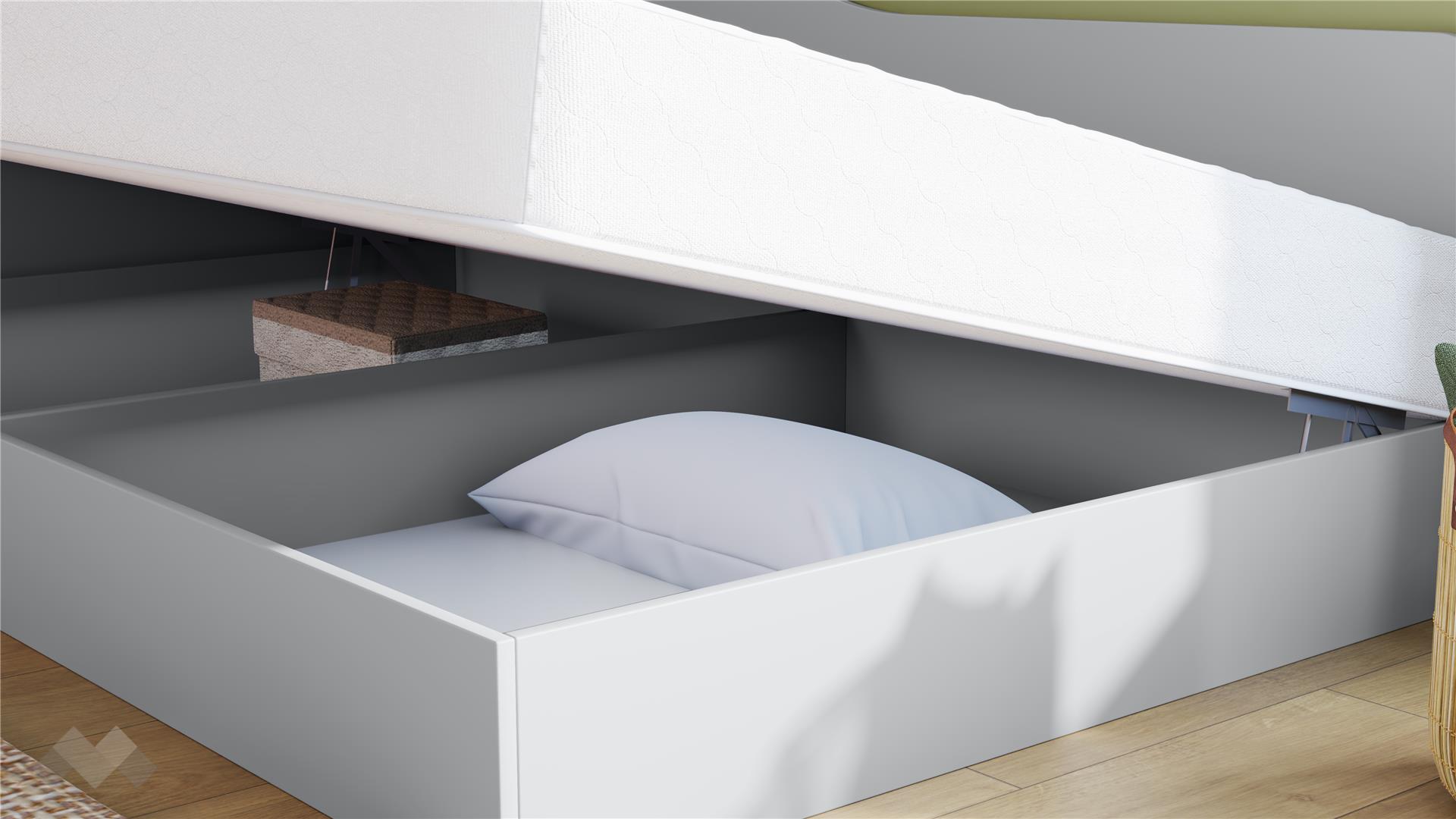 Включеният повдигащ пружинен механизъм осигурява лесен и бърз достъп до подматрачното пространство, което е перфектно за съхранение на спално бельо, играчки, сезонни дрехи и други вещи.