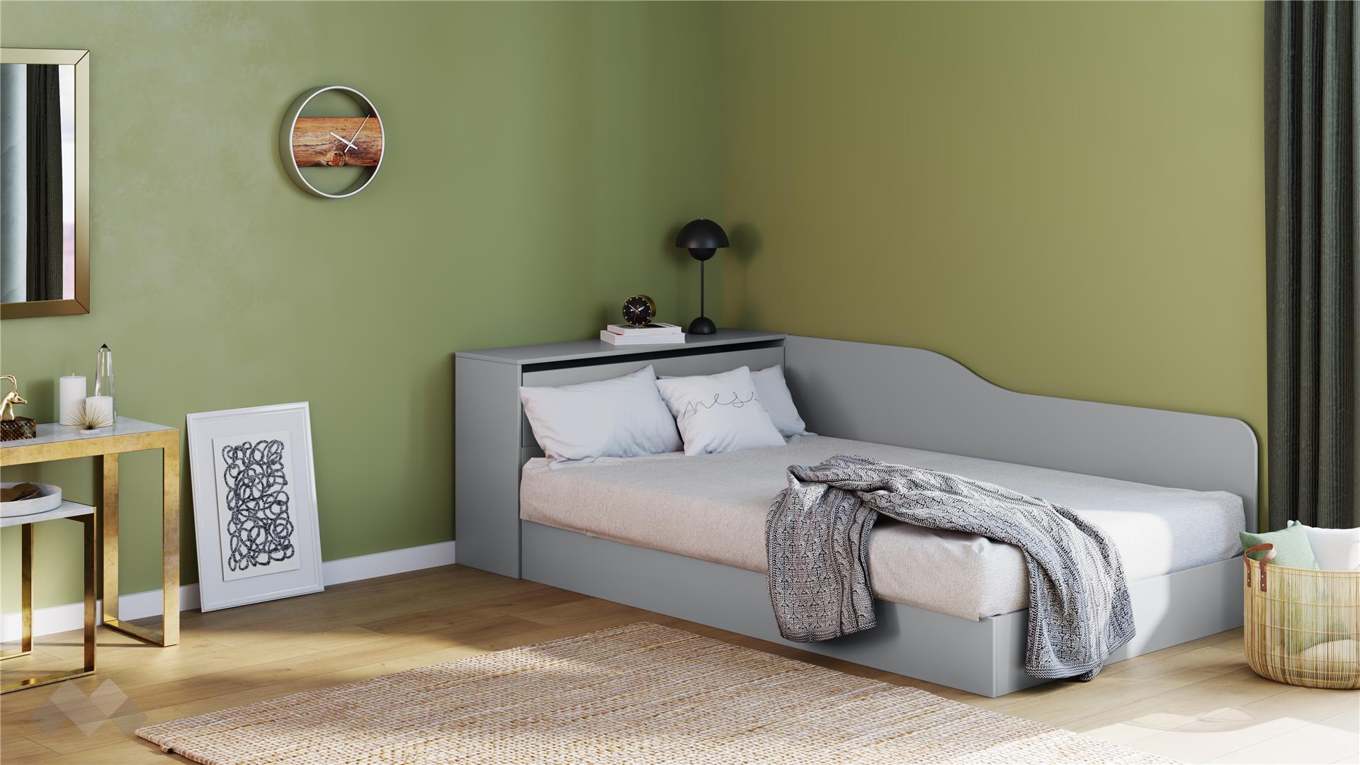 Леглото е с универсално разположение – по време на монтажа, изолиращата табла и механизма могат да се монтират отляво или от дясно, така че да пасне идеално на стаята. Подходящо е за матрак с размери 120/190 см.