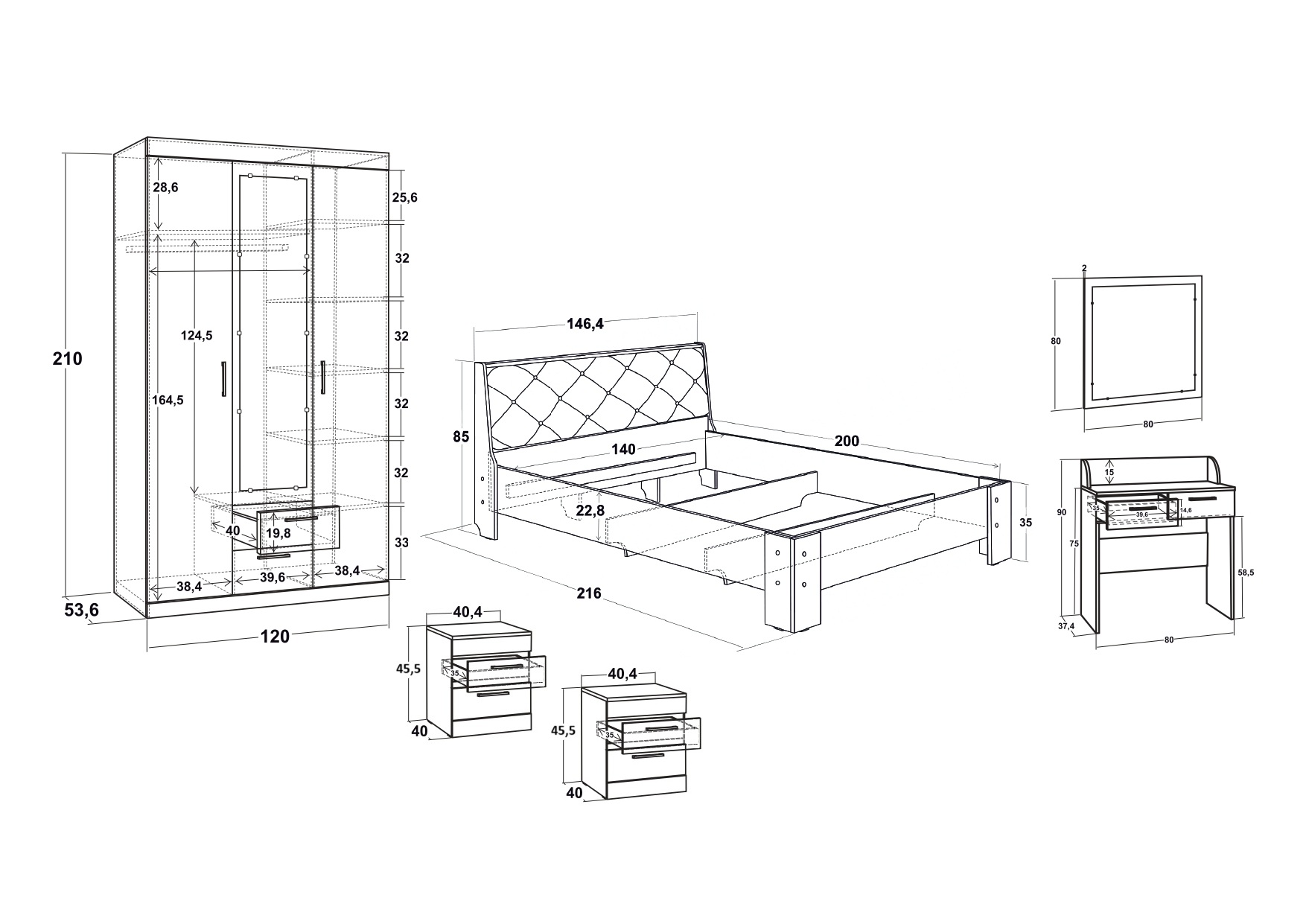 ✓ спалня с тапицирана табла ✓ трикрилен гардероб ✓ тоалетка ✓ огледало ✓ 2 броя нощни шкафчета ✓ елегантен дизайн ✓ качествена изработка ✓ 16 мм ПДЧ
