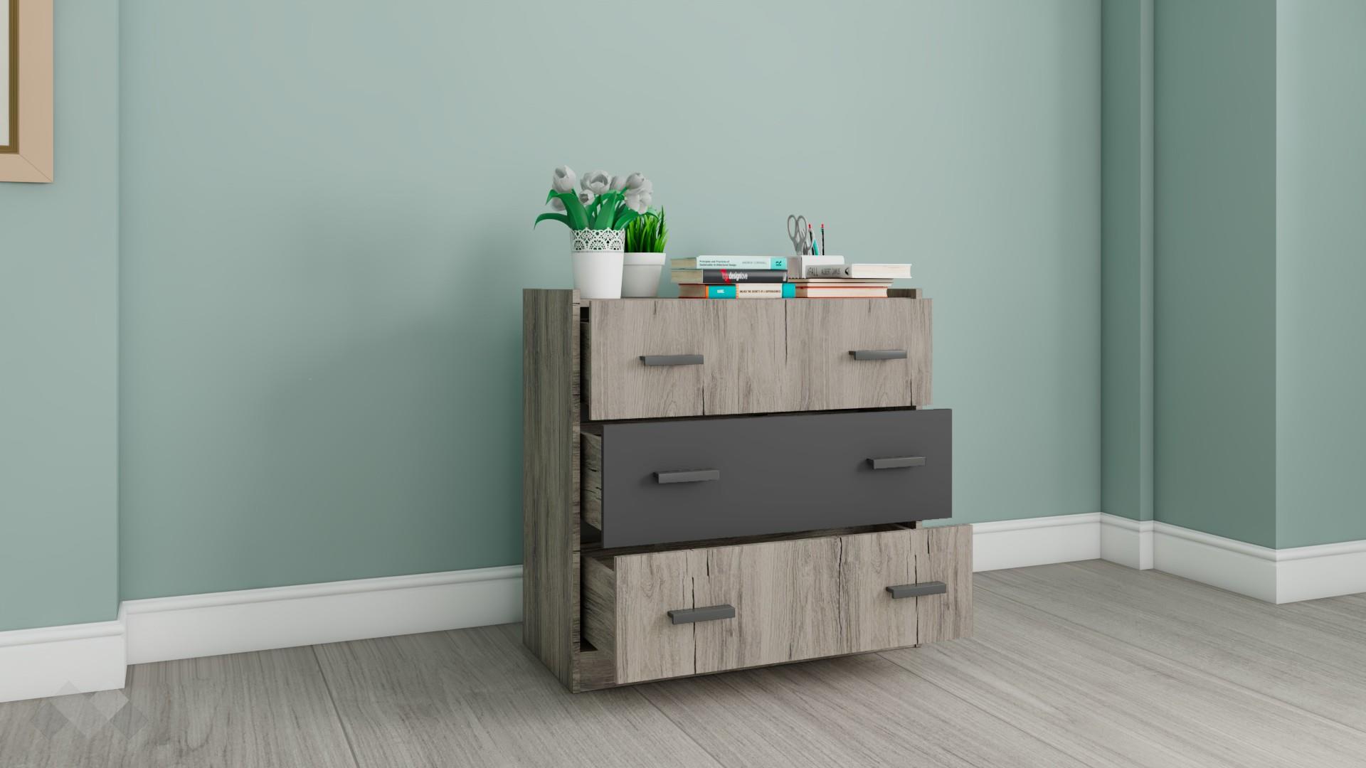 ✓ 3 чекмеджета ✓ компактен и практичен ✓ модерен винтидж декор с WNR структура ✓ качествена изработка ✓ 16 мм ПДЧ