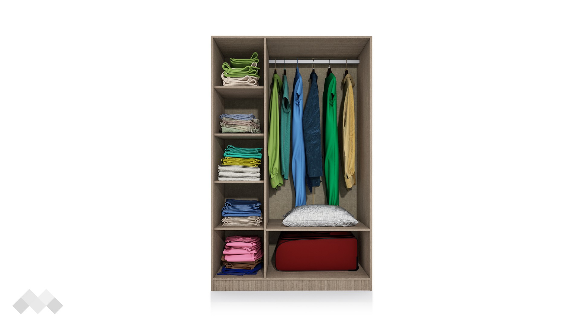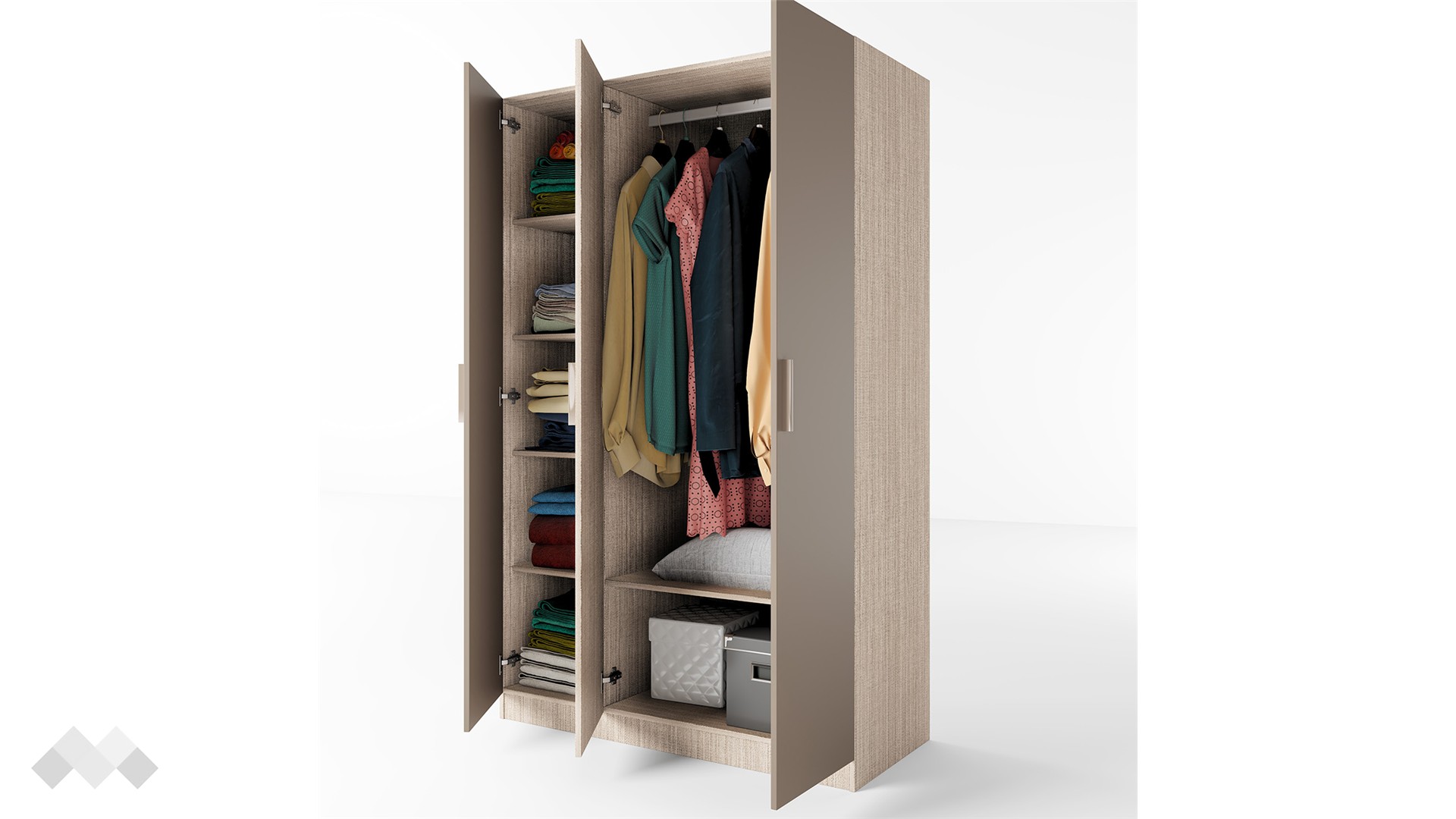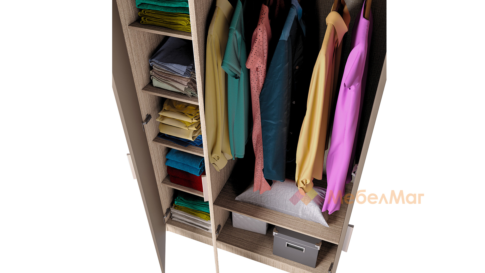 Гардероб Спрингфийлд добре се съчетава както с цветове в сивата, така и с цветове в кафявата гама. Той е трикрилен, с 5 рафта и лост за закачалки. Има добре обмислено разпределение, което ще ти позволи да подредиш добре всички свои дрехи и аксесоари прилежно. Можеш да използваш рафтовете за съхранение на сгънати дрехи, а на лоста да закачиш всичко, което искаш да ти бъдат бързо под ръка.