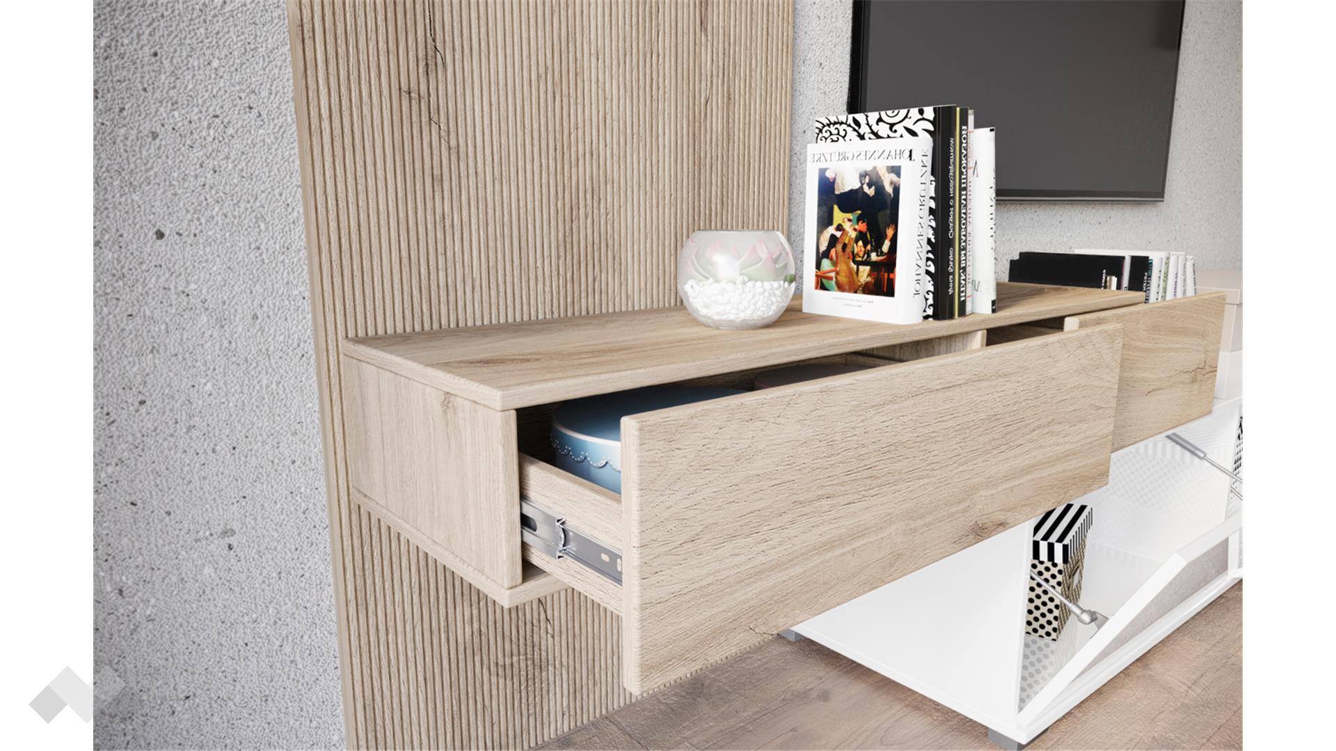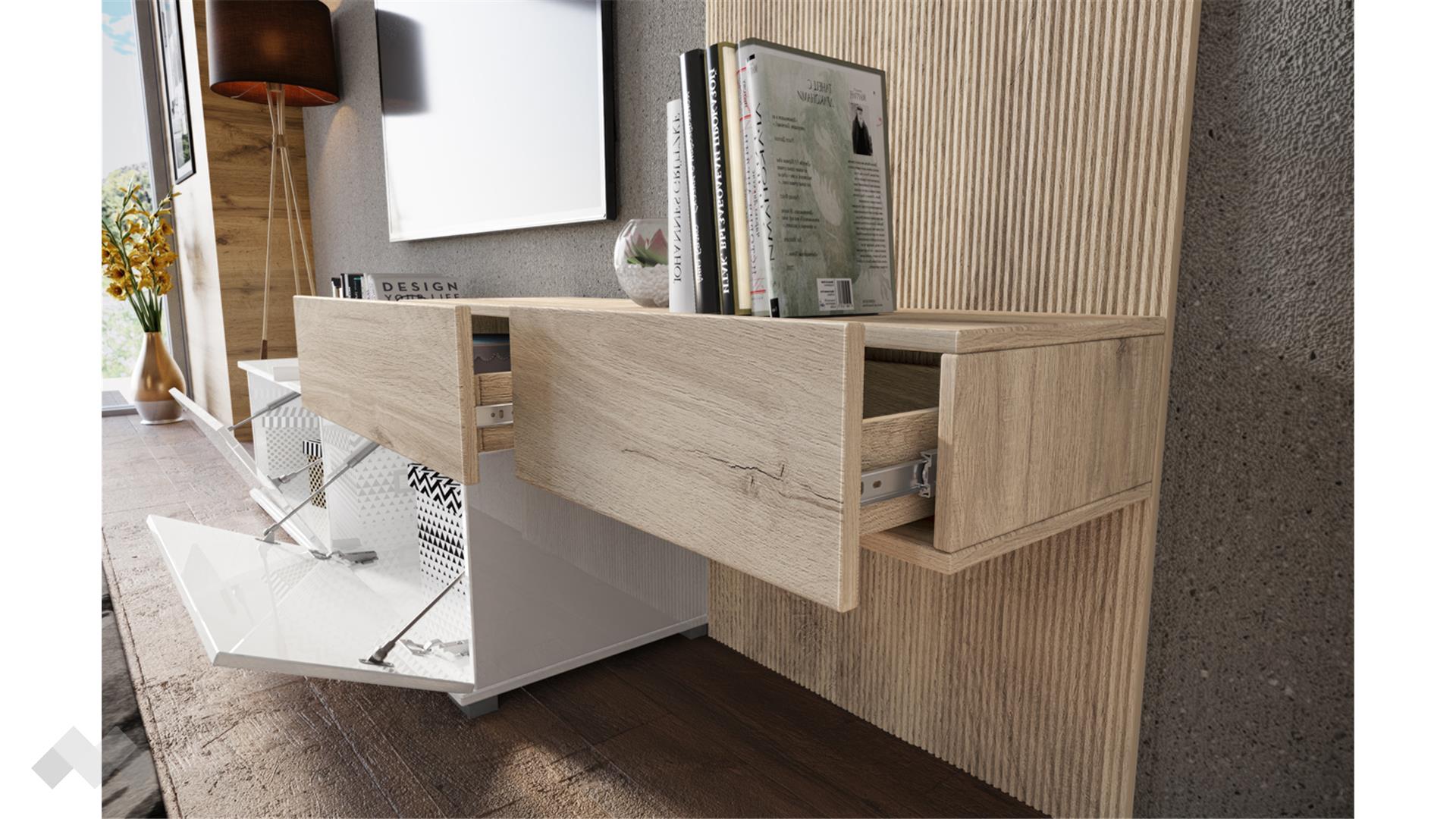 Моделът разполага с две чекмеджета с пълно изтегляне и плавно затваряне и два шкафа, снабдени с пуш бутони и падащи вратички. Там можеш да съхраняваш всяка вещ, от която модерният хол се нуждае.