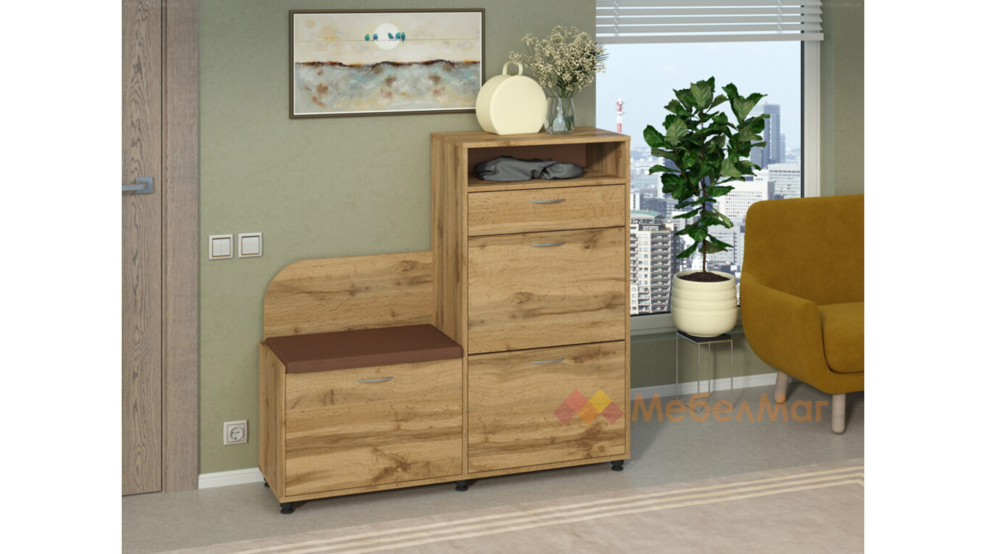 Шкафът е компактен, но в същото време много практичен, защото побира много обувки в малко пространство. Разполага с три вратички — шкаф със специален механизъм за обувки, под него още един шкаф с вратичка, и до тях е разположен шкаф, над който има удобна малка пейка, на която можеш да седнеш, докато се обуваш.