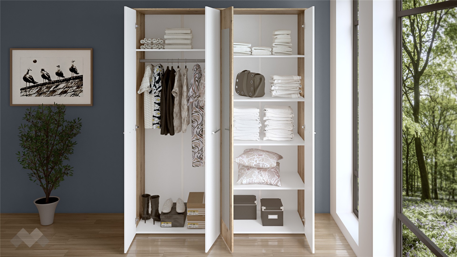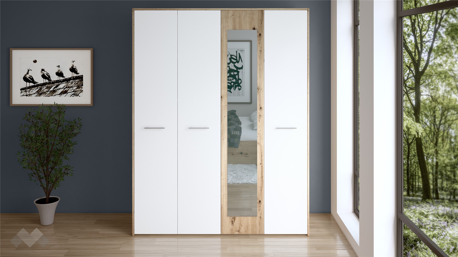 Искаш да създадеш хармоничен и натурален интериор в спалнята, който да носи усещане за уют, комфорт и неподправеност? Четирикрилен гардероб Вангард е перфектното съчетание на семпъл и изчистен дизайн в комбинация от цвят артизан с бяло, носещ асоциации на близък до природата стил.