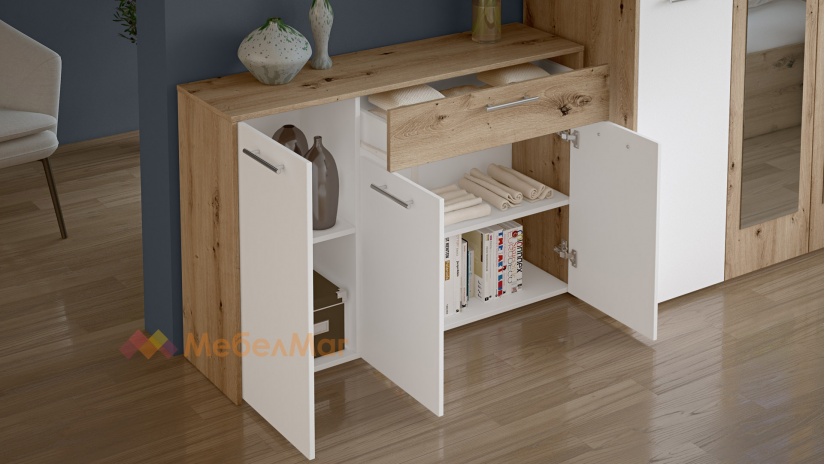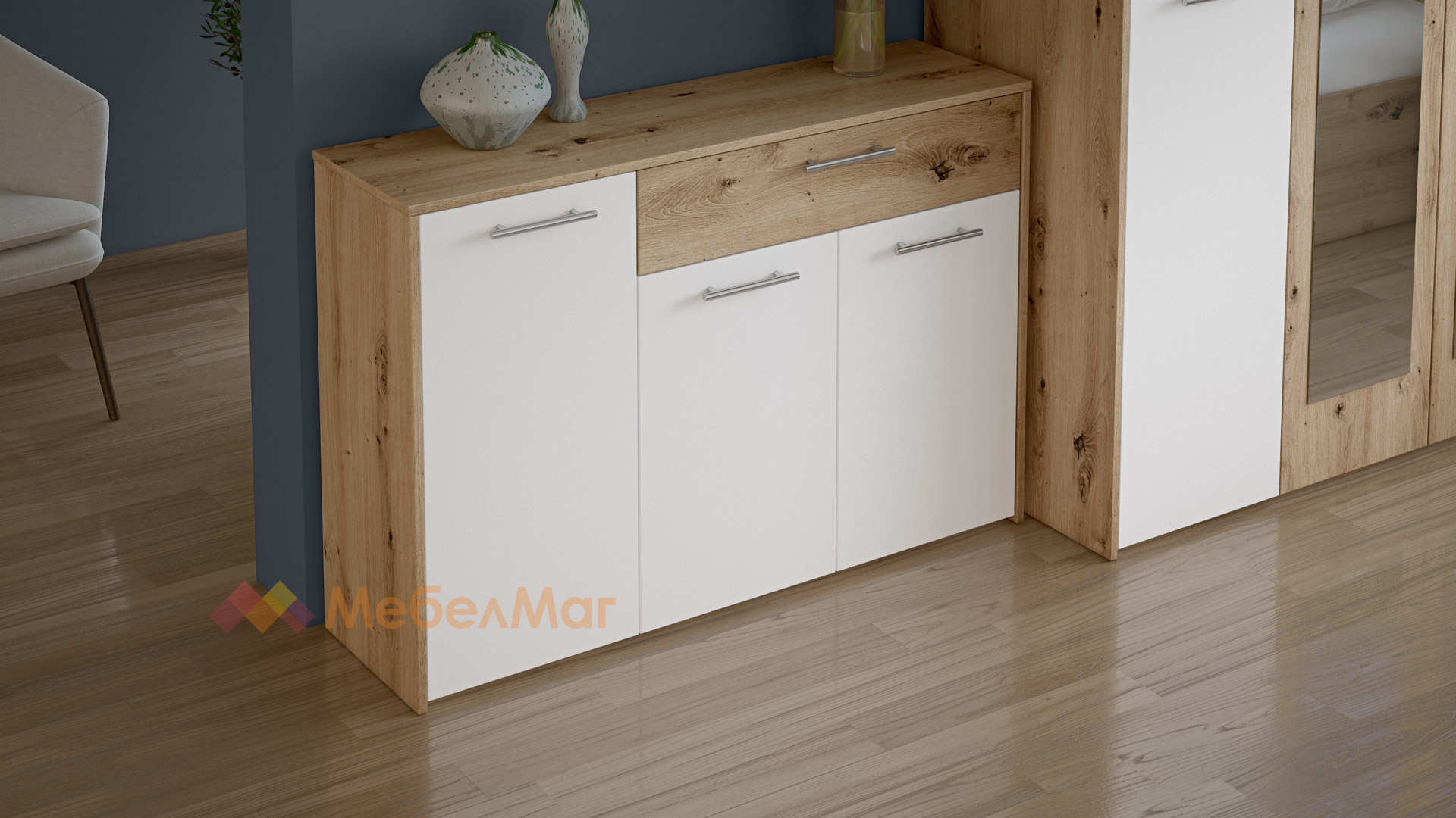 Скринът ще те впечатли с изчистени форми, модерен дизайн и функционално разпределение.На твое разположение са чекмедже и два затворени шкафа. Моделът щети предостави допълнително място за съхранение на дрехи и бельо, а върху горния плот може да подредиш козметика, аксесоари или ефектна декорация.