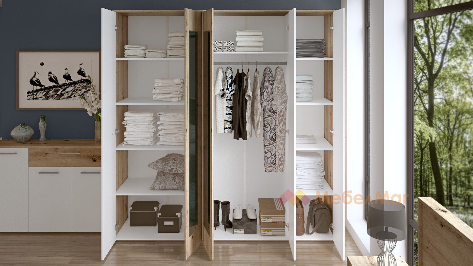 Петкрилният гардероб съчетава практичност и добре обмислено разпределение, благодарение на което ще можеш да подредиш и съхраняваш вещите си, както ти е удобно. Моделът разполага с 12 рафта, на които можеш да поставиш спално бельо, дрехи и кутии за съхранение с по-дребни вещи и лост за закачалки, на който ще намериш място за елегантните си тоалети. Разполагаш и с 2 огледала, на които ще се погрижиш за външният си вид, за да се чувстваш винаги комфортно и удобно.