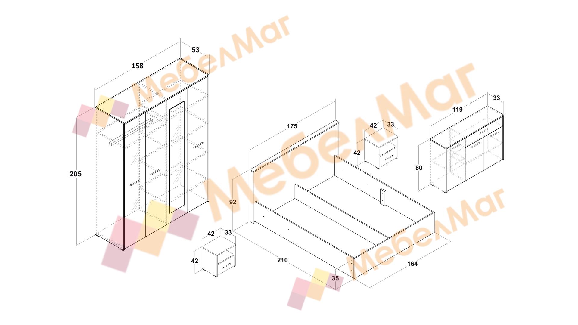 Нощен шкаф /2 броя/: Д: 42см. Ш: 33см. В: 42см.