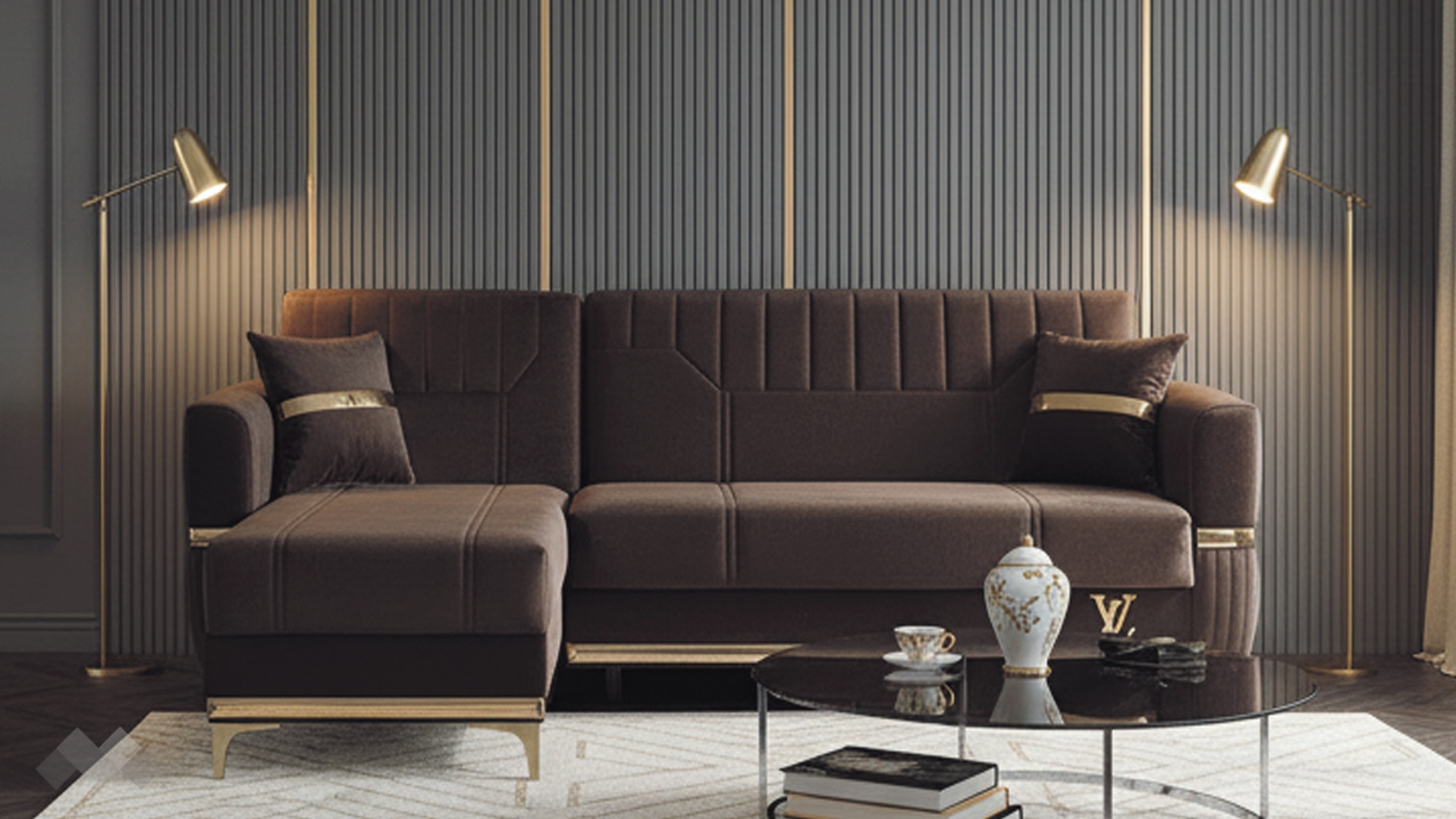 Елегантният Ъглов диван Верино впечатлява с луксозен дизайн и изключително внимание към детайла. Моделът комбинира топли цветове с изящни златисти акценти, които му придават премиум излъчване и създават усещане за класa и елегантност.