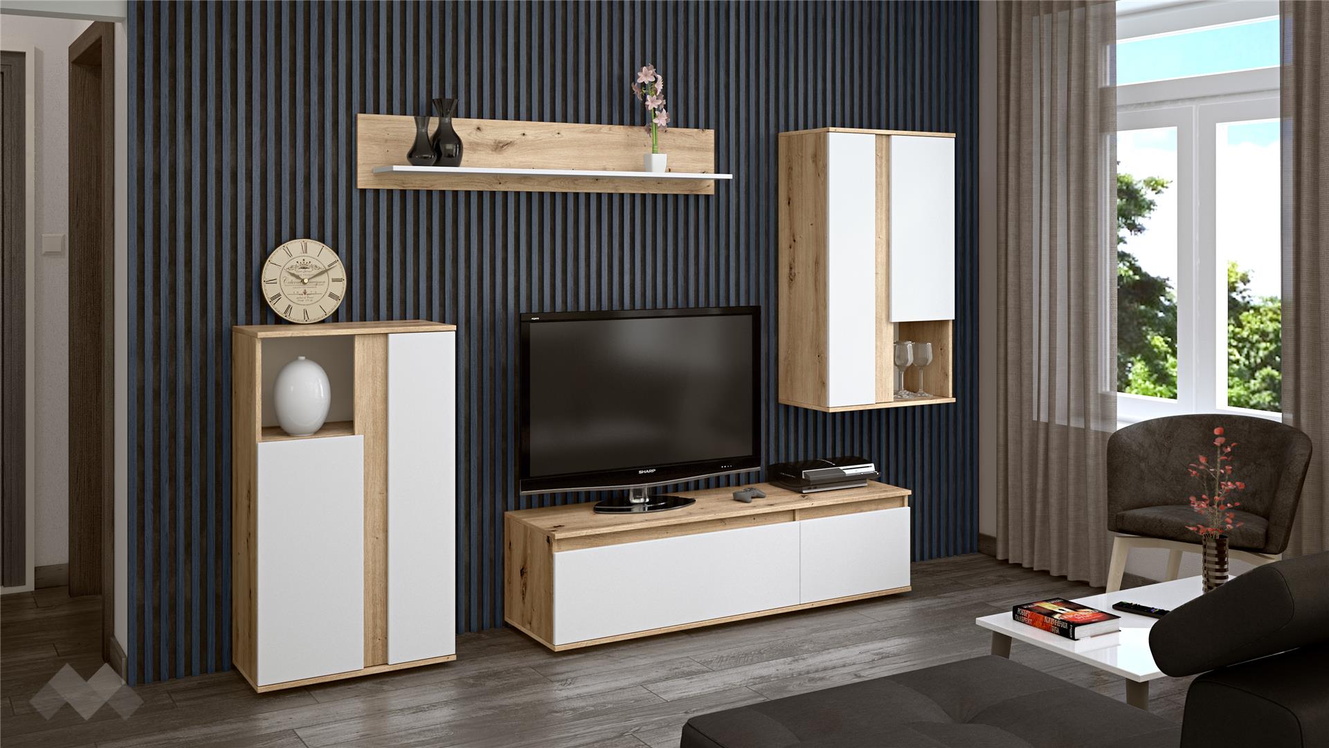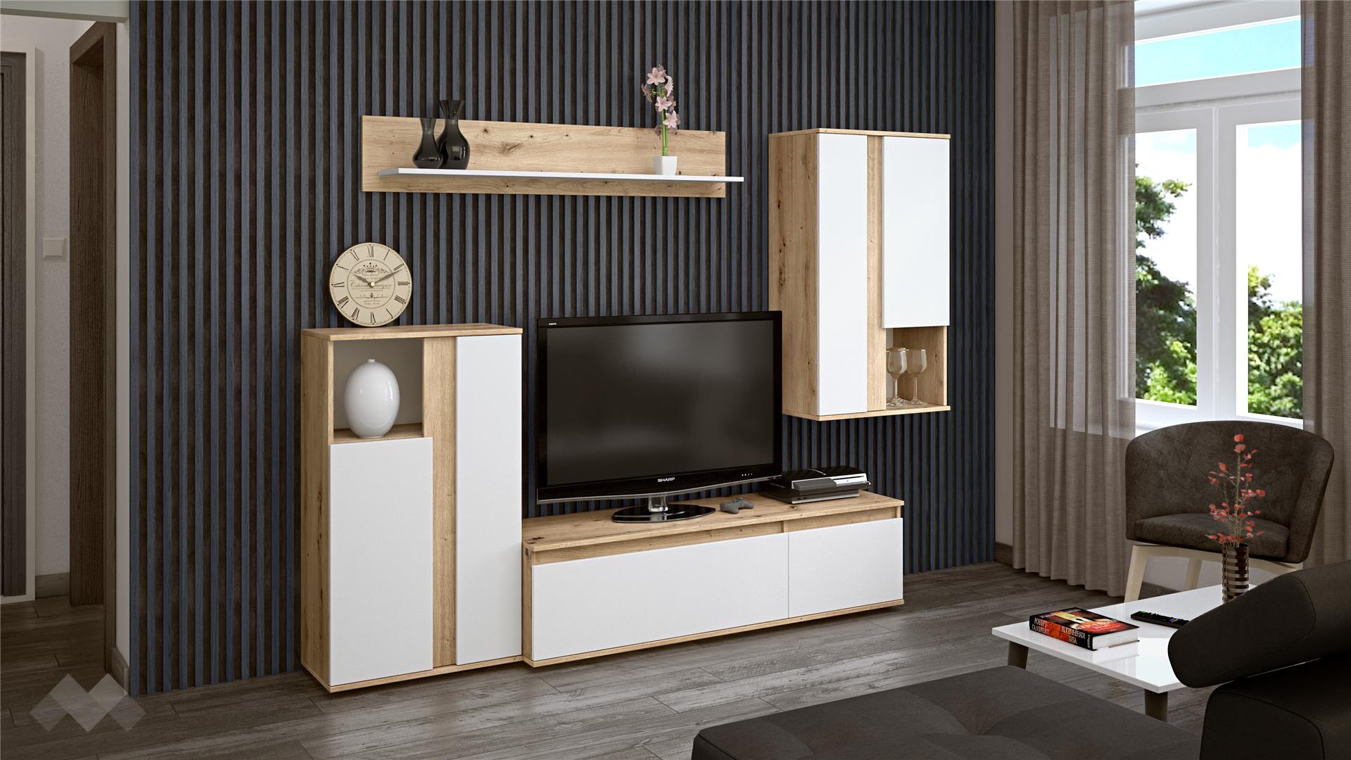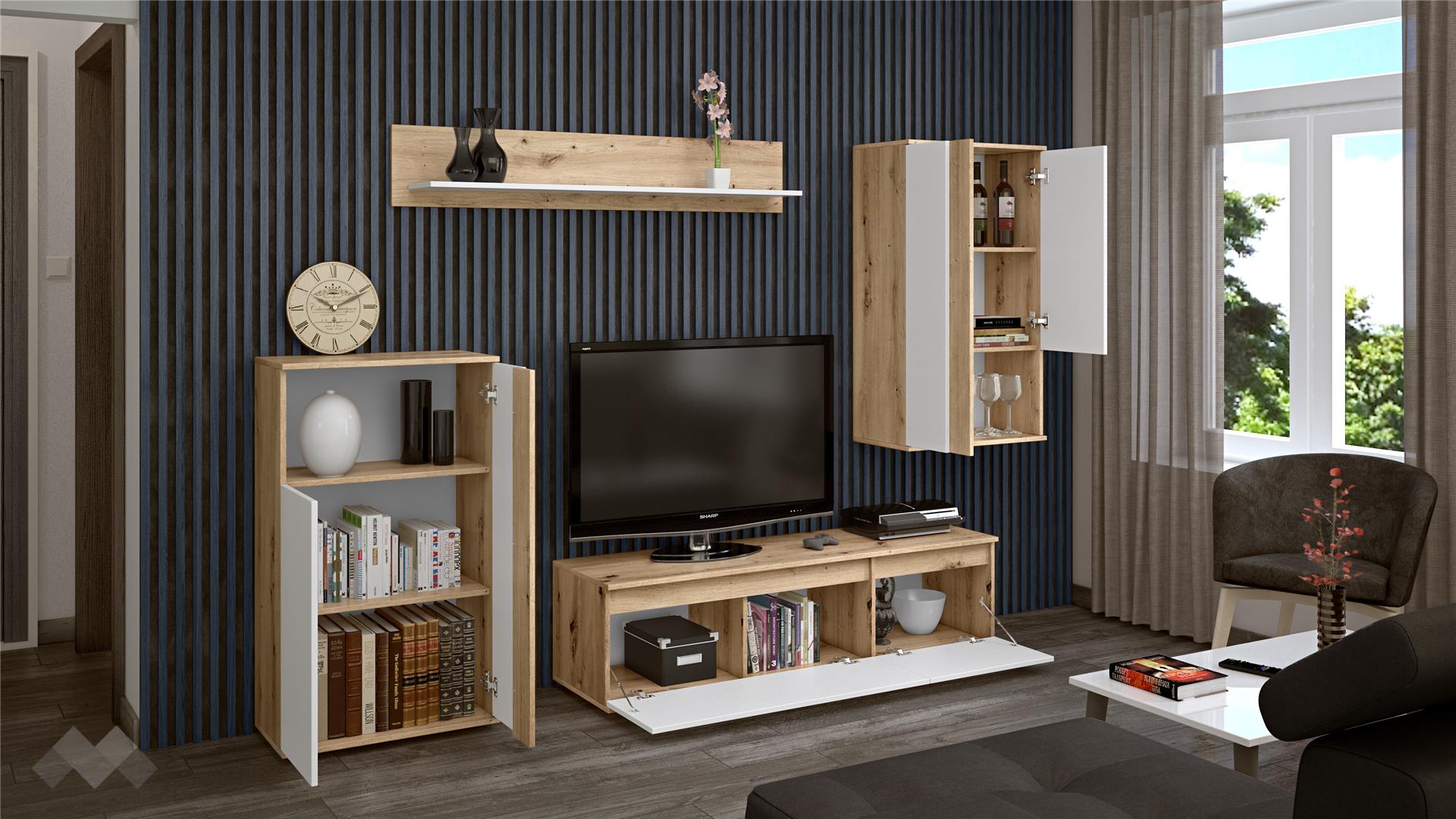⭐ Предимства: ✓ 2 отворени рафта ✓ ТВ шкаф ✓ 2 високи шкафа ✓ етажерка ✓ модерен дизайн ✓ функционална и практична ✓ качествена изработка ✓ 16 мм ПДЧ