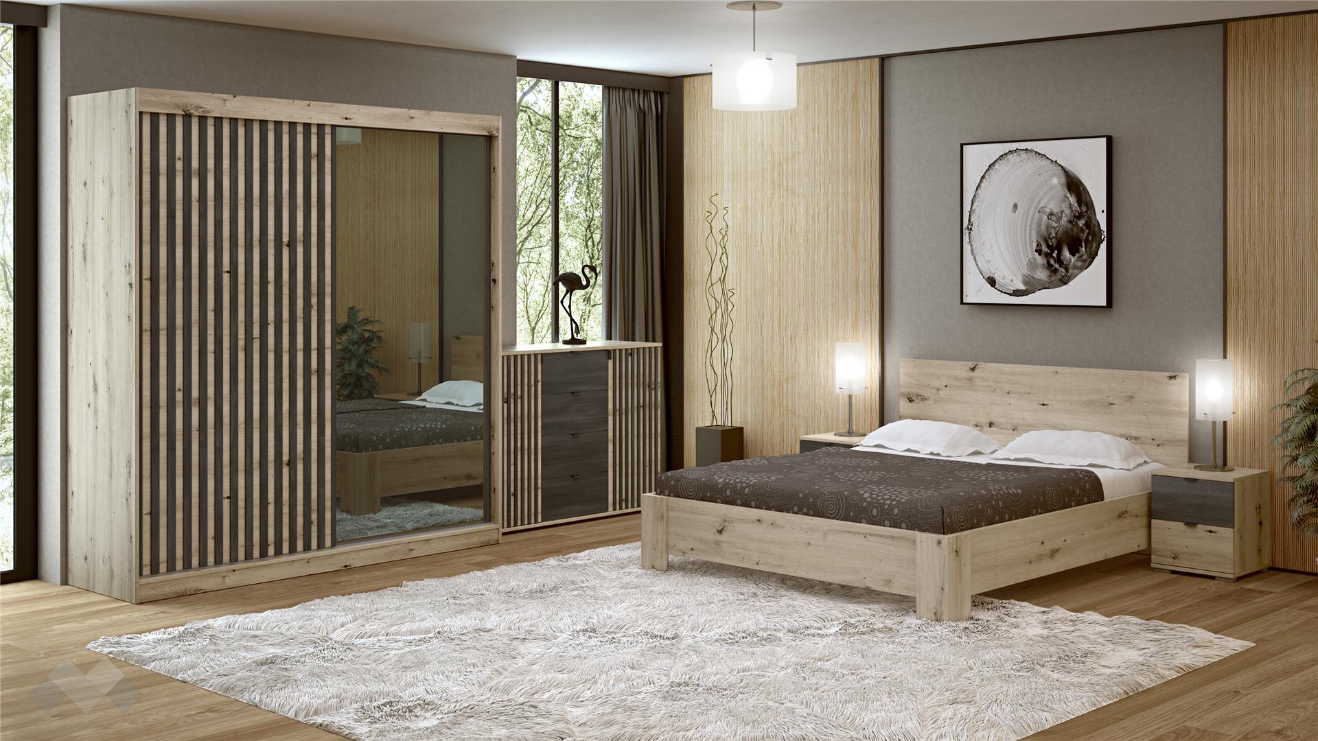 Още едно изкусително предложение от нас - Спален комплект Верона. Стил, практичност и уют, благодарение на модерната му визия. Контрастът между светлия дъб артисан и тъмния норвежки бор, комбинирани с вертикалната форма на ламели е изключително впечатляваща комбинация.
