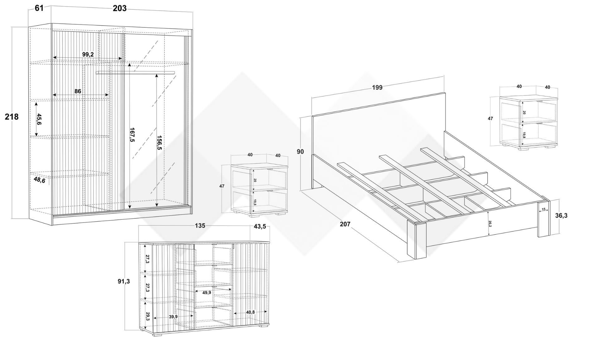 Нощен шкаф (2 бр.): Д: 40 см Ш: 40 см В: 47 см