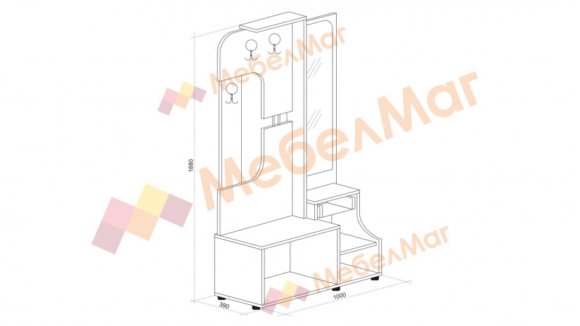 Портманто Вива разполага с голям шкаф за обувки с удобна метална дръжка, а в допълнение две ниши до шкафа могат да поберат още чифтове. Горната част на портмантото е разделена на две – в едната половина е мястото за дрехи, които да закачиш на три здрави метални закачалки, а в другата част е позиционирано голямо огледало с чекмедже, което може да ползваш като тоалетка или място за поставяне на ключове и кореспонденция.