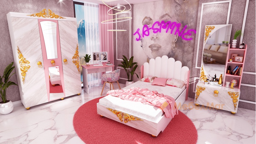 Ако искаш да създадеш пространство, в което момиченцето ти да се чувства вълшебно, щастливо и удобно, то правилният избор е детски спален комплект Ясмин. Той ще превърне детската стая в стая за истински принцеси с феерия от нежни цветове, модерни декорации - златни ПВЦ орнаменти и обков, и тапицирана табла с бяла еко кожа. Всички тези детайли добавят завършек на интериора и създават уютна и обаятелна атмосфера в това приказно кътче.