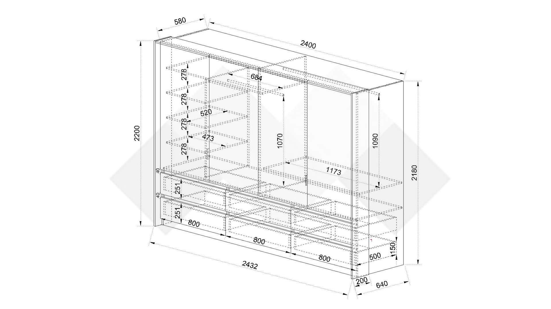Д: 243,2 см Ш: 64 см В: 220 см